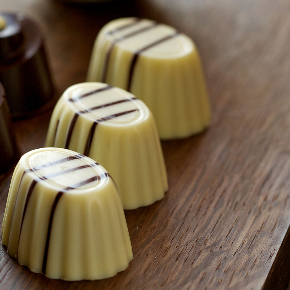 Temperierte Zartbitterkuvertüre in einen Papierspritzbeutel geben und 3 feine Linien in jede Mulde ziehen.