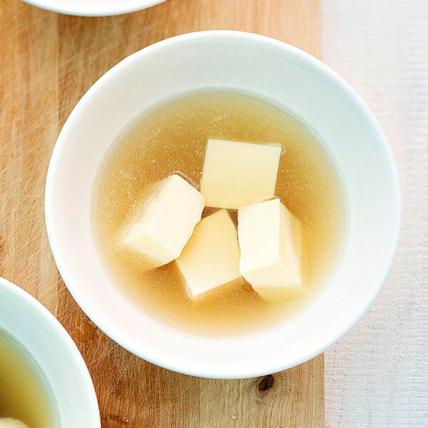 Die Eiermischung in die Form füllen und im Ofen (Mitte, Umluft 80°) in ca. 1 Std. 30 Min. stocken lassen. Eierstich aus dem Ofen nehmen und abkühlen lassen. Dann aus der Form stürzen und in mundgerechte Stücke schneiden. Eierstich mit heißer Brühe servieren.