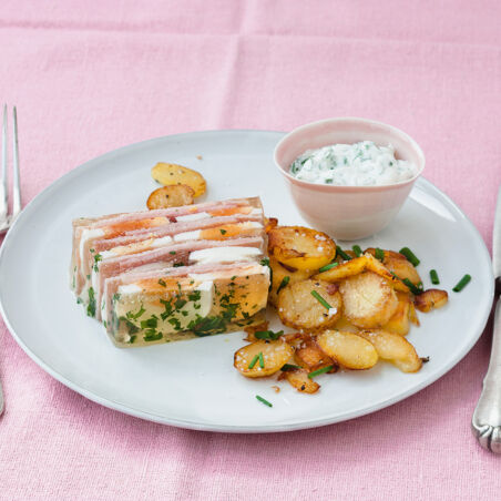 Die Sülze aus der Form lösen, dazu die Form kurz in heißes Wasser stellen. Sülze in Scheiben schneiden, mit Bratkartoffeln und Kräuterquark, Sauce tartare oder Remoulade servieren.