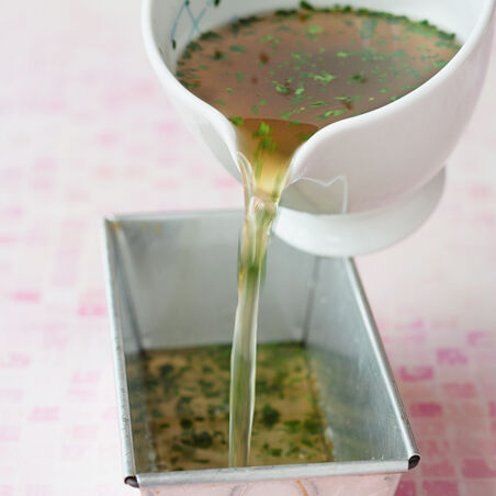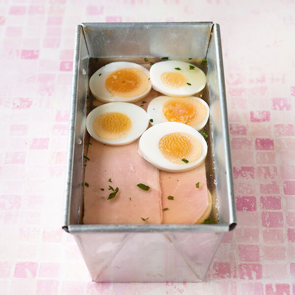 Eine Kastenform kalt ausspülen. Etwa 100 ml von der Brühe in die Form gießen und im Kühlschrank in ca. 30 Min. fest werden lassen. Inzwischen die Eier in ca. 7 Min. hart kochen, dann abkühlen, pellen und in Scheiben schneiden. Den Schinken in Stücke schneiden.