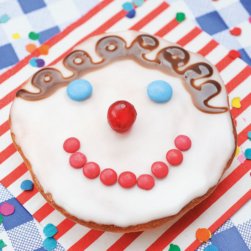 Aus Zitronensaft und Puderzucker einen cremigen Zuckerguss rühren und auf die leicht ausgekühlten Kreise streichen. Aus Belegkirschen, brauner Zuckerschrift und Smarties ein lustiges Clowngesicht auf die Törtchen zaubern.