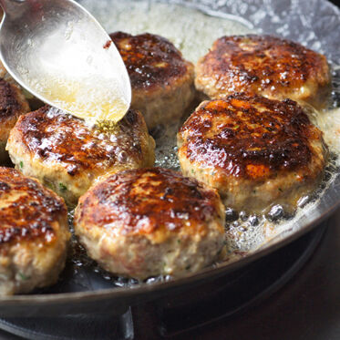 Die Frikadellen wenden und die übrige Butter dazugeben. Die Fleischküchlein in ca. 6 Min. fertig garen und auch die zweite Seite knusprig bräunen. Dabei ab und zu mit dem Bratfett begießen.