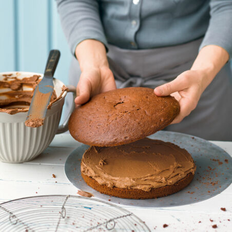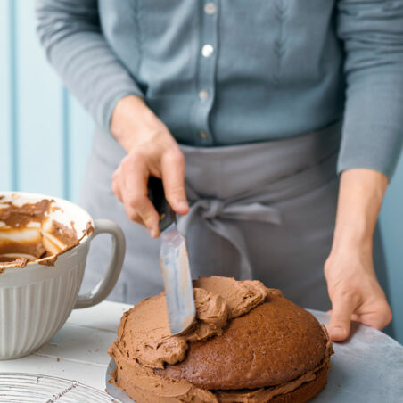 Am nächsten Tag den Biskuit aus der Form lösen und einmal waagerecht durchschneiden. Den unteren Boden auf eine Kuchenplatte legen. Die Schokoladensahne mit den Quirlen des Handrührgeräts nur ganz kurz dick-cremig aufschlagen. Die Hälfte der Creme auf den unteren Biskuit streichen, den oberen Boden darauflegen. Oberseite und Rand der Torte mit der übrigen Creme bestreichen.
