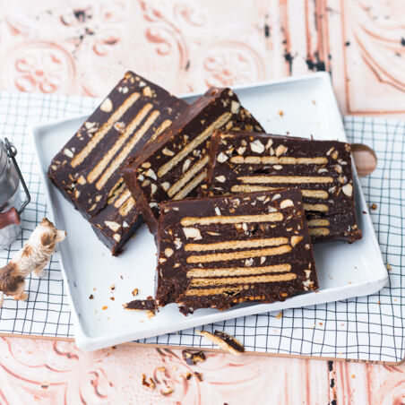 Den Kuchen mindestens 4 Std. oder am besten über Nacht kalt stellen. Mithilfe der Frischhaltefolie aus der Form lösen und auf eine Kuchenplatte stürzen. Den Kuchen mit dem restlichen Kakaopulver bestäuben und mit einem scharfen Messer in etwa 1 cm dicke Scheiben schneiden.