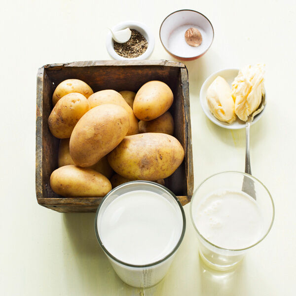 Die Kartoffeln schälen und in dünne Scheiben schneiden oder hobeln. Eine große Auflaufform leicht buttern, die Kartoffeln in die Form geben – es ist nicht nötig, die Scheiben dachziegelartig einzuschichten.