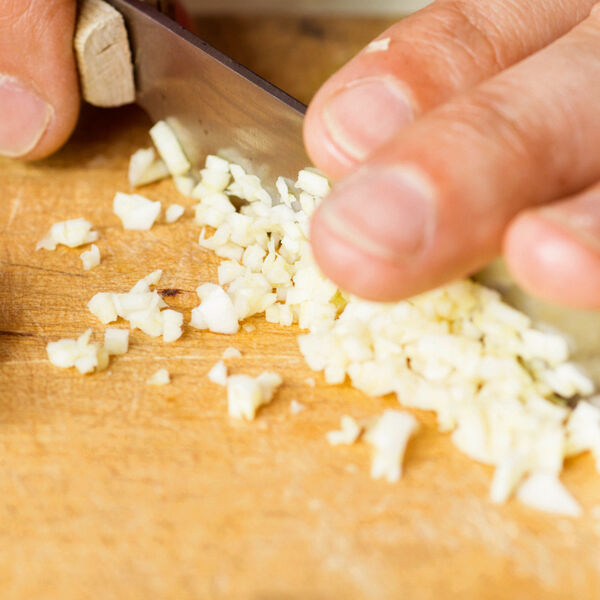 Backofen auf 190° vorheizen. Milch und Sahne verrühren. Den Knoblauch schälen und sehr fein hacken oder durchpressen. In die Milchmischung geben, mit Salz, Pfeffer und Muskat so kräftig würzen, dass die Mischung leicht überwürzt schmeckt.