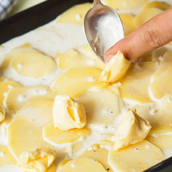 Für dieses Gratin werden die Kartoffelscheiben roh eingeschichtet.