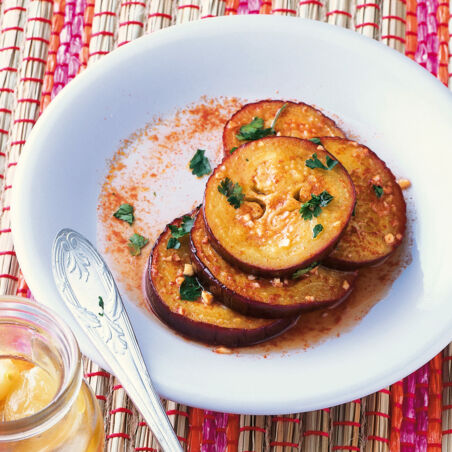Die Auberginen aus dem Ofen nehmen, die Scheiben noch warm in eine Servierschale schichten und mit der Marinade beträufeln. Bei Zimmertemperatur abkühlen lassen, mit Frischhaltefolie abdecken und mind. 2 Std. im Kühlschrank marinieren. Rechtzeitig vor dem Servieren aus dem Kühlschrank nehmen, denn bei Zimmertemperatur schmecken die eingelegten Auberginen am besten.
