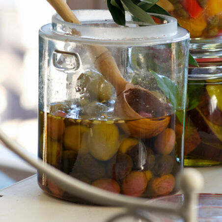 Die Oliven in einem Sieb abtropfen lassen. Sehr salzige Oliven mit kaltem Wasser bedeckt über Nacht stehen, dann gründlich abtropfen lassen.