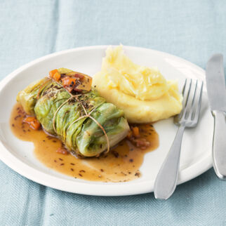 Von den Kohlblättern die dicken Rippen flach schneiden und die Blätter auf der Arbeitsfläche ausbreiten. Die Hackfleischmasse in die Mitte der Kohlblätter geben. Die Blätter seitlich einschlagen, von der Längsseite her aufrollen und mit Küchengarn fixieren.