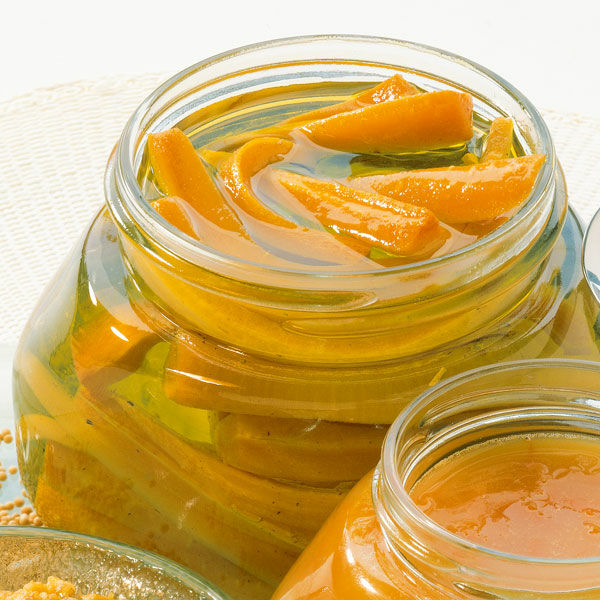Senfkörner und Kreuzkümmel im Mörser zerstoßen. Öl erwärmen, die Gewürze einrühren. Möhren in sterilisierte Twist-off-Gläser füllen. Das Öl dazugießen und verschließen.