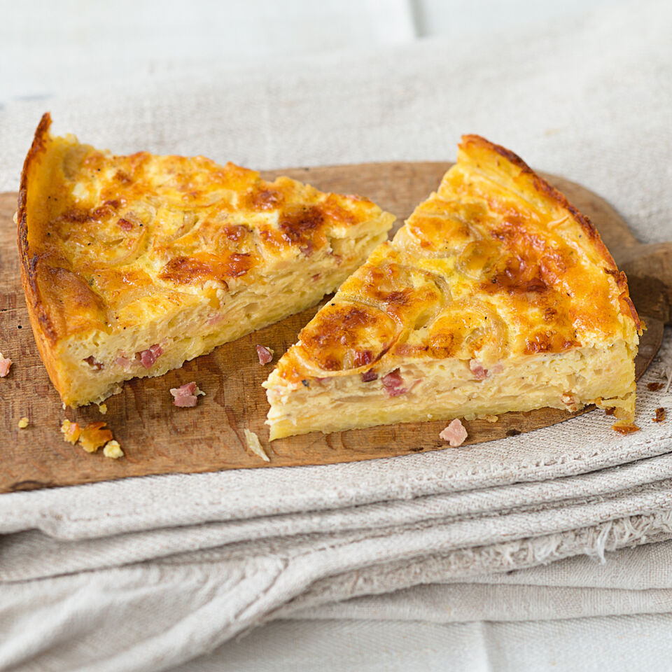 Hinter dem Namen dieser Schweizer Spezialität versteckt sich ein köstlicher Käse-Zwiebelkuchen mit Kartoffteig. Wer möchte ein Stück probieren?