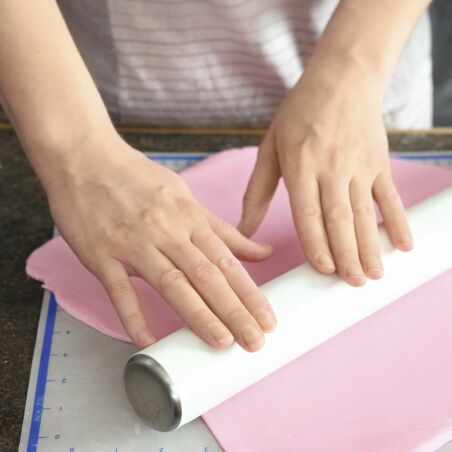 Den Fondant weich kneten und auf der mit Stärke bestäubten Silikonmatte mit dem Rollstab 4-5 mm dick ausrollen. Achtung: Die Arbeitsfläche unbedingt sauber halten, denn nichts ist ärgerlicher als ein Fussel im fertigen Meisterwerk.