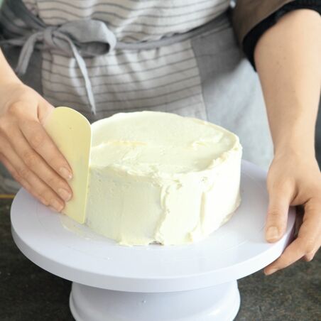 Die Torte mit der restlichen Buttercreme einstreichen. Dabei die Teigkarte am Tortenrand und zugleich auf dem Drehteller gerade aufsetzen. Mit einer Hand die Karte gerade halten, mit der anderen den Teller Stück für Stück drehen.