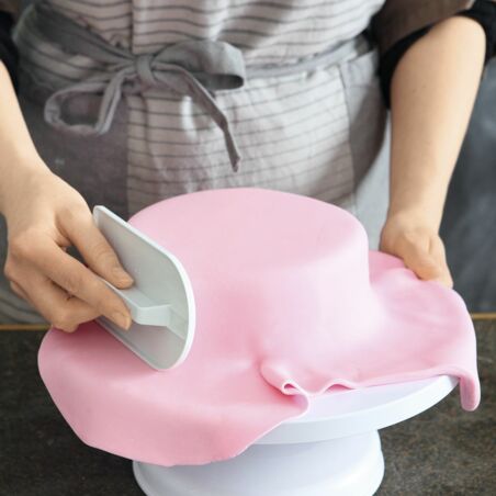 Den Fondantglätter ohne Druck aufsetzen, gerade halten und die Oberfläche mit kreisenden Bewegungen glatt streichen. Nun den Fondant auch an der Seite rundum glatt an den Tortenrand streichen. Dabei von oben nach unten arbeiten und den Drehteller zu Hilfe nehmen. Ich arbeite gern mit zwei Glättern und drehe die Torte zwischen beiden.