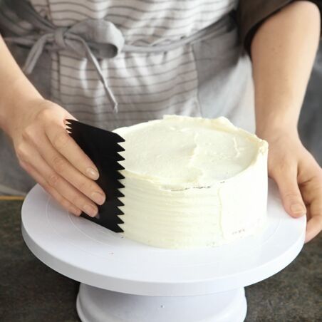 Tolle Muster am Tortenrand ergibt ein gewellter oder gezackter Tortenkamm. Den Kamm an der Torte ansetzen und den Teller drehen oder den Kamm freihändig von unten nach oben durch die Creme ziehen. So verzierte Torten werden dann nicht mehr mit Fondant eingedeckt.