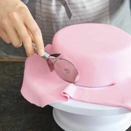 Den Fondant rundherum mit dem Pizzaschneider grob kürzen. Jetzt erneut mit dem Glätter um den Rand fahren und überstehende Fondantränder leicht andrücken. Erst dann die Kante gerade abschneiden. Diese beiden Schritte sind in dieser Reihenfolge wichtig, da die Fondantdecke sonst leicht zu kurz gerät.