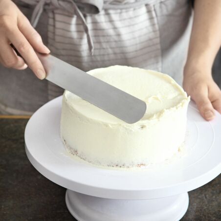 Den gefüllten Tortenboden auf das Cake Board setzen und auf dem Drehteller platzieren. Etwa ein Drittel der Buttercreme auf die Torte geben und mit der Teigkarte oder Palette rundum glatt einstreichen. Diese dünne Schicht (Crumb Coat) schließt Kuchenkrümel ein und erlaubt ein sauberes Ergebnis. Die Torte vor dem Weiterverarbeiten ca. 1 Std. kalt stellen.