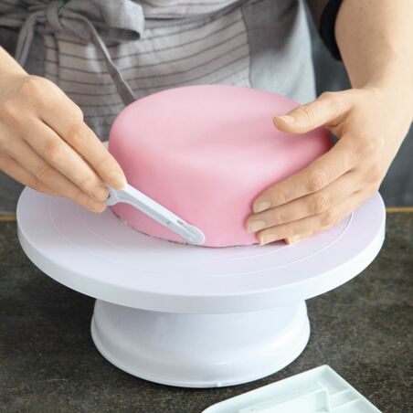 Für einen exakten Abschluss verwende ich ein kleines Schneidrad. Mein Tipp: Unschöne Kanten lassen sich prima mit kleinen Buttercreme-Pünktchen verdecken. Diese einfach um den unteren Tortenrand herum aufspritzen. Oder man legt ein hübsches Stoffband um die Torte. Das Band mit Royal Icing oder Lebensmittelkleber befestigen.