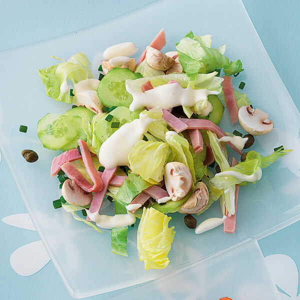 Eisbergsalat mit Pilzen, Gurke und Kochschinken