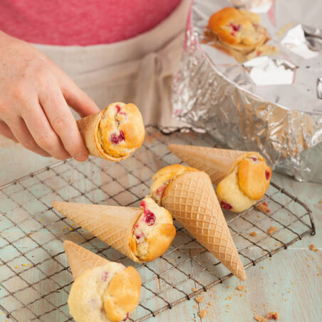 Hier gibt’s die kleinen Küchlein mal in der Eiswaffel auf die Hand statt auf den Teller! Das kommt (nicht nur) an heißen Tagen bei kleinen und großen Süßschnäbeln gut an.