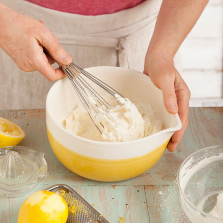 Inzwischen für das Topping Quark mit Puderzucker, Zitronensaft und -schale glatt rühren. Die Sahne steif schlagen und unterheben. Vor dem Servieren je 1 »Eiskugel« vom Topping auf die Cupcakes geben. Mit den übrigen Beeren verzieren und mit Zucker bestreuen. Evtl. übriges Topping extra dazu reichen.