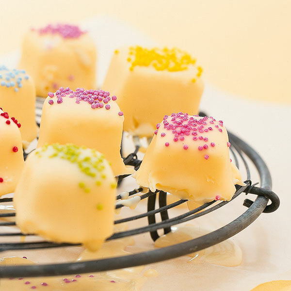 Die Würfel nacheinander mit einer Gabel in die Kuvertüre tauchen, auf ein zweites Brett legen, mit Zuckerstreuseln verzieren und gleich wieder ins Gefrierfach stellen. Auf diese Weise nach und nach alle Nougatwürfel verarbeiten. Und dann – auch nach und nach – die Pralinen aus dem Gefrierfach naschen.