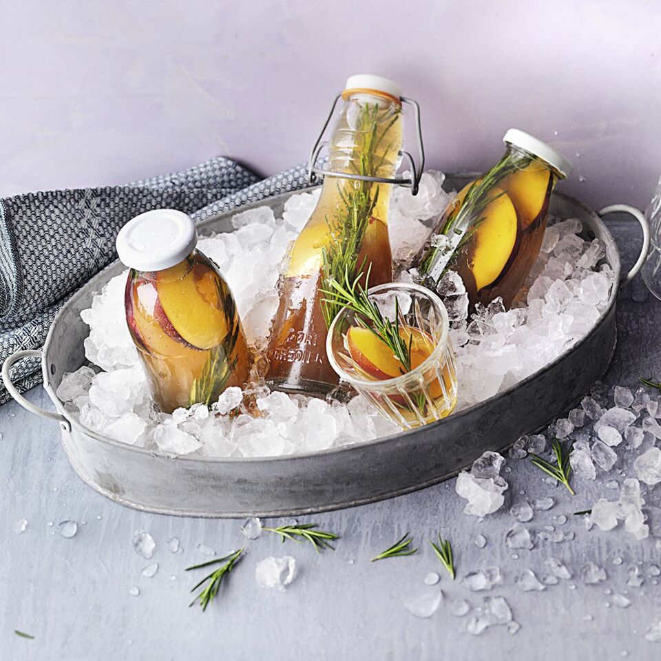 Tipp: Nicht nur mit schwarzen Teeblättern ist kalt gezogener Tee (diese »Brühmethode« macht ihn weniger bitter und klarer als beim herkömmlichen Aufgießen mit heißem Wasser) ein echter Sommerhit. Probiere ihn unbedingt auch einmal mit Rooibos, grünem Tee oder Oolong. Und statt Pfirsich und Rosmarin gibt es noch etliche weitere hervorragende Aromaspender: Orange-Limette-Minze, Heidelbeeren-Aprikose, Ananas-Himbeere-Zitronenmelisse …