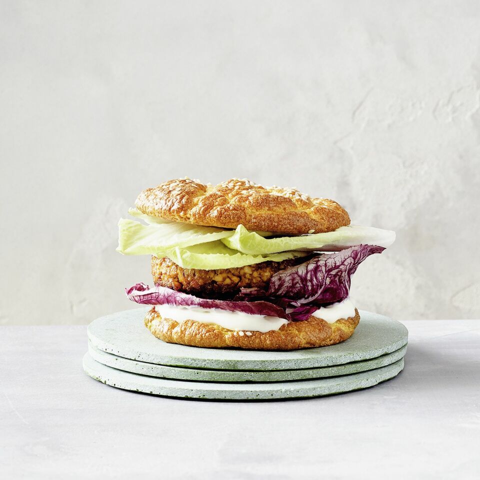 Restliches Öl in der Pfanne erhitzen und die Pattys darin von jeder Seite ca. 4 Min. knusprig braten. In der Zwischenzeit die Salatblätter waschen und gut abtropfen lassen. Auf zwei Teller je eine Brötchenscheibe legen und mit 1 EL Crème fraîche bestreichen. Je 2 Blätter Radicchio, 1 Tofu-Patty und 3 Chicoréeblätter darauflegen. Mit einer zweiten Brötchenscheibe bedecken und sofort servieren.
