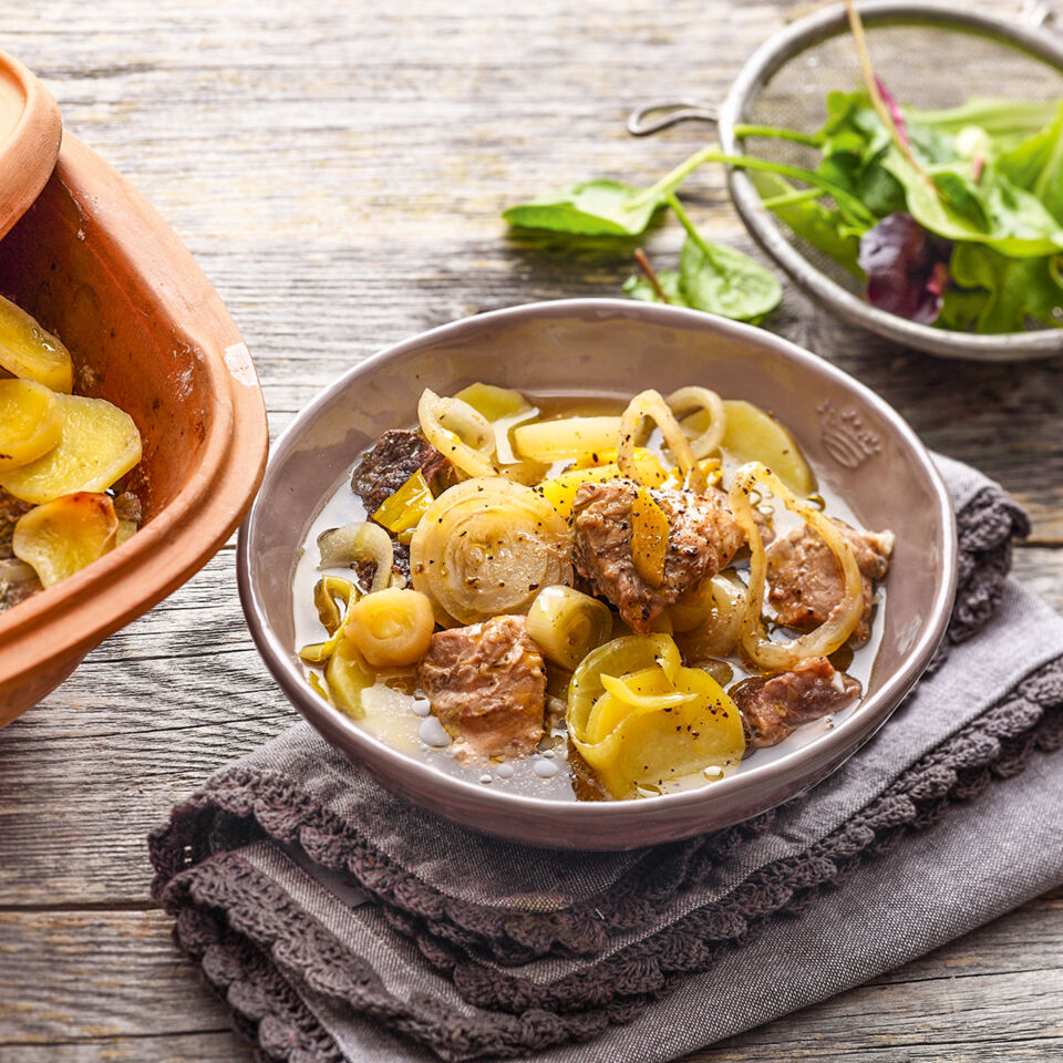 Eine ofenfeste Form oder einen Römertopf mit Butter einfetten und die Zutaten in folgender Reihenfolge einschichten: Kartoffeln, Lauch, Fleischmischung. Den Vorgang wiederholen und mit Kartoffeln und Lauch abschließen. Jede Schicht mit Salz und Pfeffer würzen. Die Marinade darüber- gießen. Die Form oder den Topf mit einem Deckel verschließen. Im Ofen (Mitte) ca. 3 Std. garen. Dazu passen Baguette und ein grüner Salat.