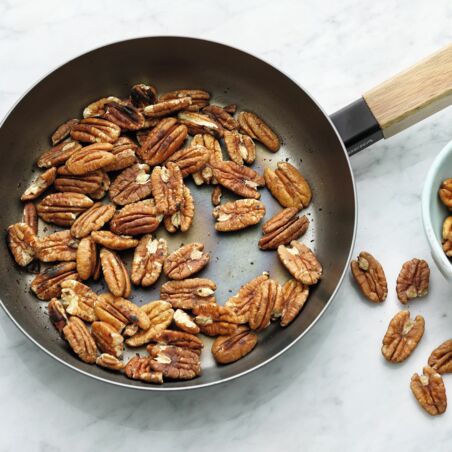 Die Pekannüsse in einer beschichteten Pfanne ohne Fett bei mittlerer Hitze rösten, bis sie duften. Vom Herd nehmen und abkühlen lassen. Den Salat längs halbieren, quer in dünne Streifen schneiden, waschen und trocken schleudern. Die Äpfel waschen, vierteln und entkernen. Die Viertel dann quer in dünne Scheiben schneiden. Den Käse mit den Fingern zerbröseln.