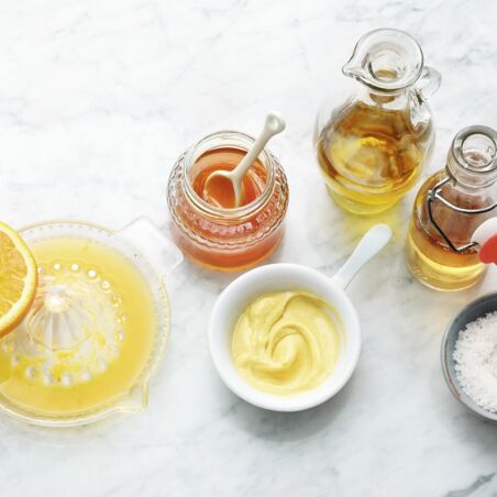 Öl, Essig, Orangensaft, Honig, Senf und ½ TL Salz in einer Schale zu einem Dressing verrühren.