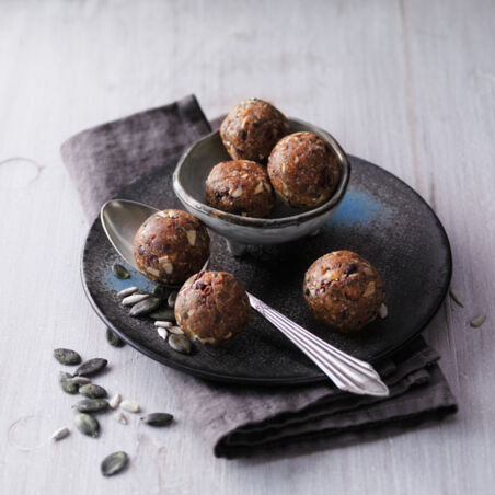 Aus der Masse mit angefeuchteten Händen ca. 15 gleich große Kugeln formen. Die Energiekugeln gekühlt aufbewahren und genießen. Im Kühlschrank halten sich die Kugeln ca. 1 Woche.