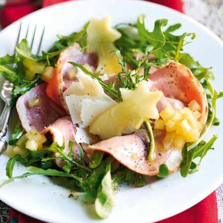 Die Entenbrustscheiben auf dem Rucola dekorativ anrichten. Mit Pfeffer übermahlen. Mit der Apfelvinaigrette beträufeln. Den Parmesan mit dem Sparschäler in feine Scheibchen hobeln und über das Carpaccio streuen. Sofort servieren.