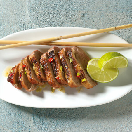 Frühlingszwiebeln waschen, putzen und die hellen Abschnitte sehr fein hacken. Chilis putzen und samt Kernen fein hacken. Ingwer schälen und reiben. Zwiebeln, Chilis, Limettensaft und -schale, Ingwer, Sojasauce und Zucker mischen, mit Salz und Pfeffer abschmecken. Die Entenbrüste ringsum mit Marinade bestreichen, zugedeckt im Kühlschrank ca. 6 Std. marinieren.