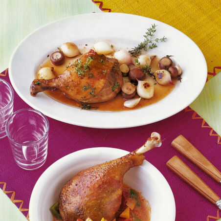 Die Entenkeulen mit Salz und Pfeffer einreiben. Thymian waschen und trockenschwenken, Blättchen abzupfen. Chili zerkrümeln. Die Schalotten schälen und ganz lassen.