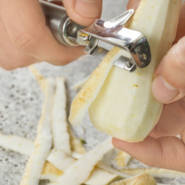 Zwiebel und Petersilienwurzel schälen. Die Zwiebel halbieren und in dünne Scheiben schneiden. Petersilienwurzel längs in dünne Scheiben, dann in dünne Streifen schneiden. Quer klein würfeln.