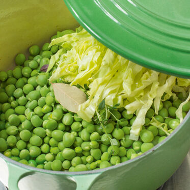Die Erbsen abschmecken, Thymianzweig und Lorbeerblatt entfernen. Das Gemüse mit seinem Dünstfond servieren.