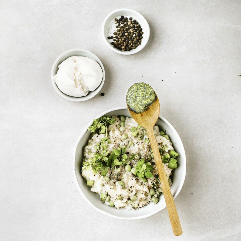 Heute kommt ein raffiniertes Risotto mit Erbsen auf den Tisch. Die Krönung sind zart schmelzende Burrata-Kugeln.