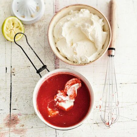 Die Datteln entkernen, in sehr kleine Würfel schneiden und unter die Erdbeermasse rühren. Die Sahne mit dem Handrührgerät steif schlagen. Ein Drittel Sahne unter die Erdbeermasse rühren, den Rest vorsichtig unterheben.