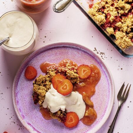 Erdbeer-Hafer-Crumble mit Vanille-Cashewcreme und Rhabarberkompott