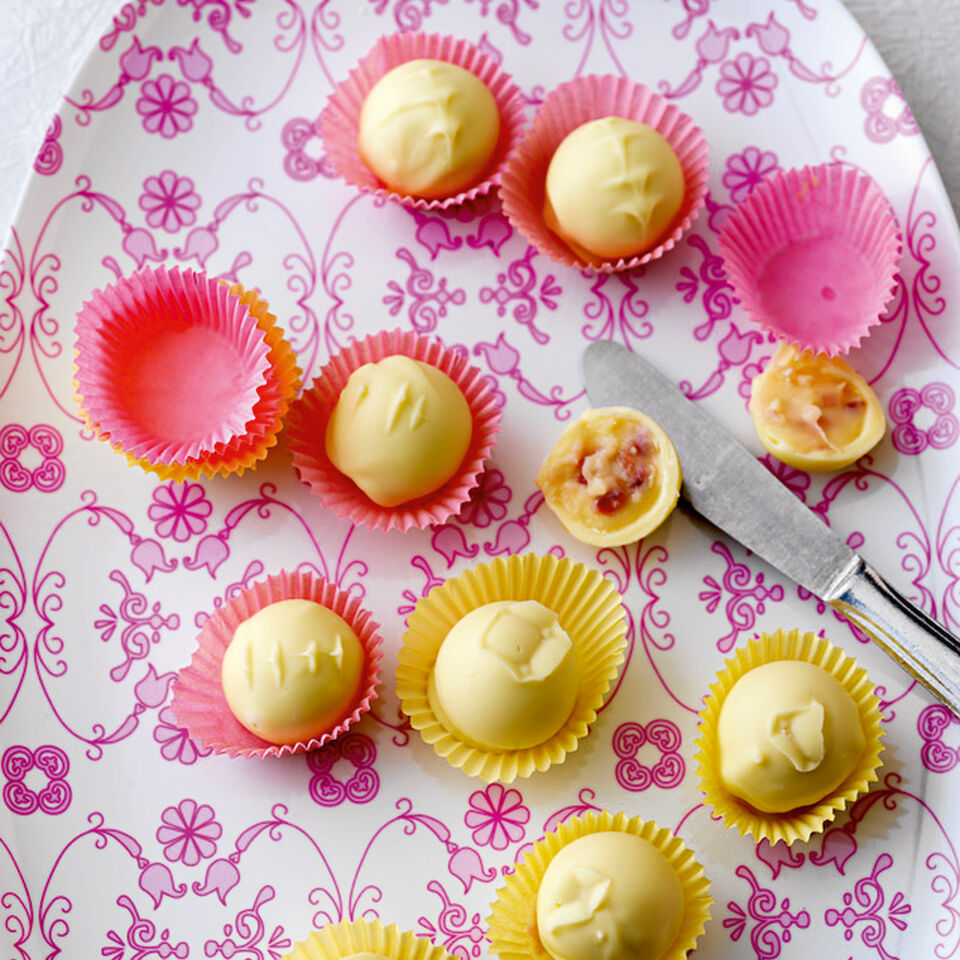 Die Masse in eine Dosierflasche geben und die Hohlkugeln damit befüllen. Dabei einen 2 mm hohen Rand frei lassen. Die temperierte Schokolade bereit stellen. Sobald die Füllung anzieht, etwas temperierte Schokolade in den Spritzbeutel aus Butterbrotpapier füllen und die Kugeln mit 1 Tupfer verschließen. Die Kugeln mit der Pralinengabel in die temperierte Schokolade tauchen und auf Butterbrotpapier ablegen. Für das Muster sofort eine Gabel leicht aufdrücken.