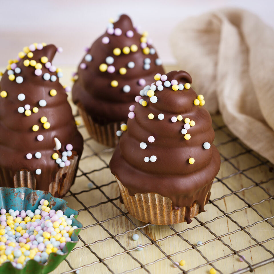 Die Schokolade hacken und mit dem Kokosfett in einer Schüssel über einem heißen Wasserbad schmelzen. Kurz abkühlen lassen. Die Cupcakes schräg über die Schüssel halten und die Schokolade mit einem Löffel über dem Hut verteilen. Mit den kleinen Zuckerperlen bestreuen und die Schokolade fest werden lassen. Bis zum Servieren kühl stellen.