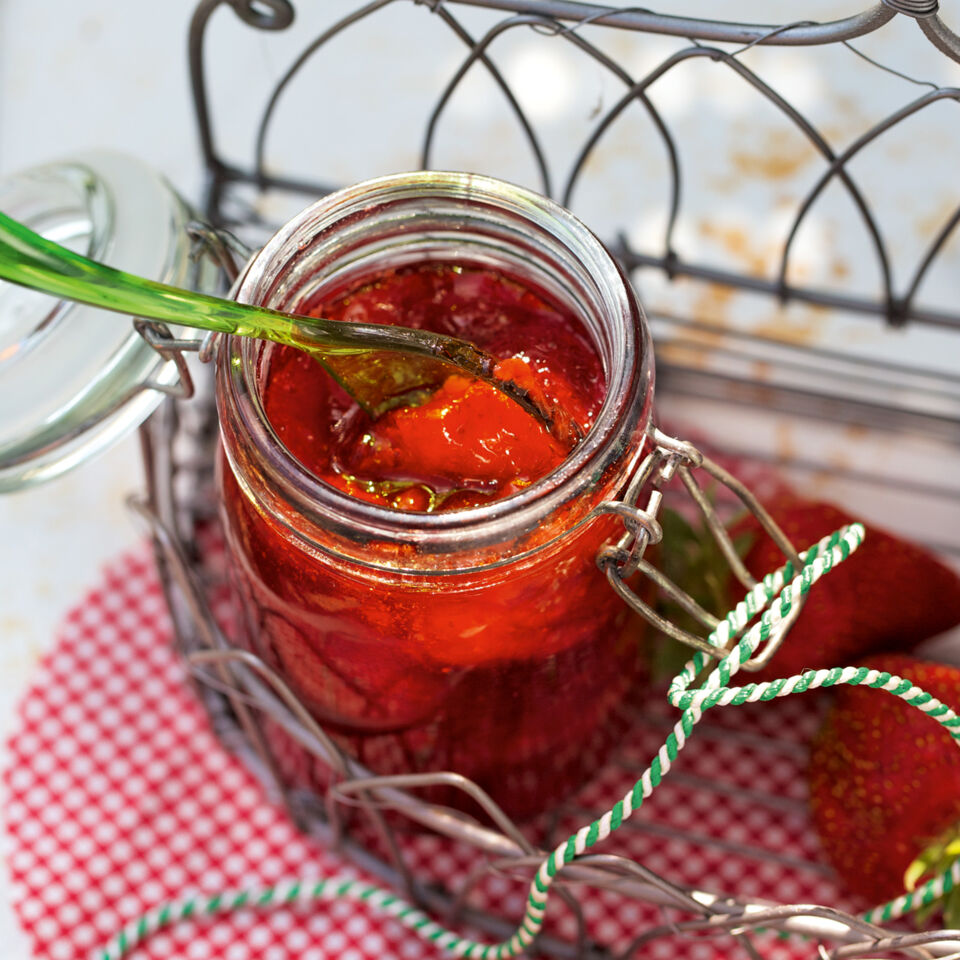 Die Marmelade in einen hitzebeständigen Messbecher füllen, in die Gläser gießen und diese fest verschließen. Die Marmelade ca. 20 Min. auf dem Deckel stehend abkühlen lassen. Dann die Gläser umdrehen und die Marmelade vollständig auskühlen lassen. An einem kühlen Ort aufbewahren – dann ist die Erdbeermarmelade ca. 1 Jahr haltbar.
