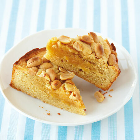 Den Teig in die Form füllen, glatt streichen. Mit Erdnusskernen bestreuen. Im Ofen (Mitte) 30-35 Min. backen. Die Oberfläche soll knusprig, das Innere noch weich sein. In der Form abkühlen lassen und in zwölf Stücke schneiden.