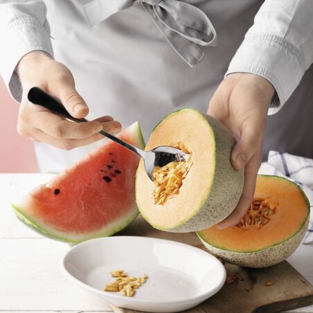 Die Melonen (bis auf die Wassermelone) halbieren und die Kerne mit einem Löffel herausschaben (Bild 1). Aus der Wassermelone eventuelle Kerne mit einem spitzen Messer herauslösen.