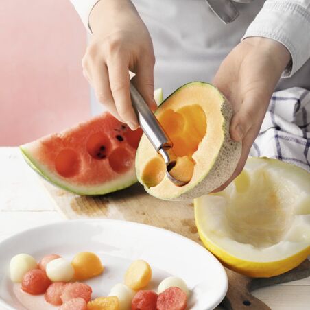 Mit dem Kugelausstecher aus dem Melonenfruchtfleisch Kugeln ausstechen (Bild 2) und auf einer flachen Platte verteilen. Die Melonenkugeln in das Tiefkühlfach stellen und ca. 1 Std. gefrieren lassen.