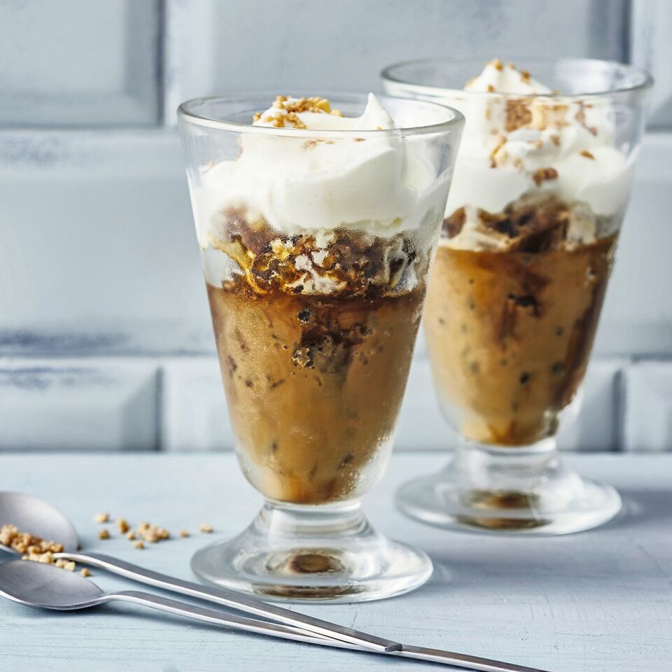Die Sahne in einer Rührschüssel mit den Rührbesen des Handrührgeräts steif schlagen. Die Granita auf vier hohe Gläser verteilen. Jeweils mit 2 cl Likör übergießen und einen Klecks Schlagsahne daraufsetzen. Mit je 1 EL Krokant bestreuen und sofort servieren.