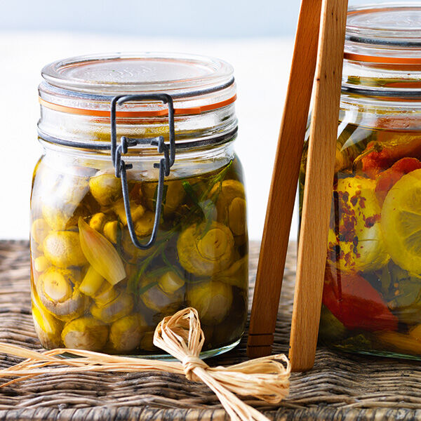 Pilze, Schalotten und Knoblauch mit einer Schaumkelle aus dem Sud in ein Sieb heben. Den Sud offen bei mittlerer Hitze ca. 5 Min. köcheln lassen. Inzwischen den Estragon abbrausen, trocken tupfen und mit Champignons, Schalotten und Knoblauch in das heiß ausgespülte Glas schichten. 400 ml heiße Marinade durch ein Sieb über die Pilze gießen, das Öl darübergeben. Das Glas sofort verschließen und die Pilze ca. 2 Wochen marinieren lassen.