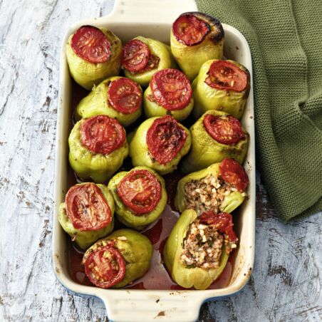 Tipp: Der Reis quillt beim Garen im Ofen auf und dehnt sich aus - daher nicht zu viel Füllung in die Paprika geben, sondern nur locker befüllen.